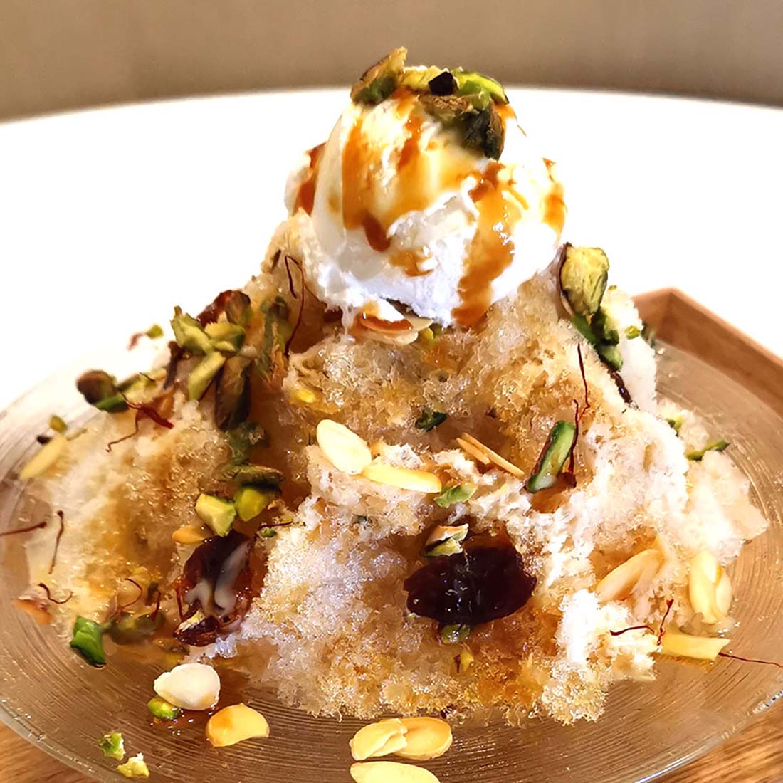 Shaved ice, date syrup, almond flakes, pistachio, condensed milk, saffron and homemade vanilla ice-cream