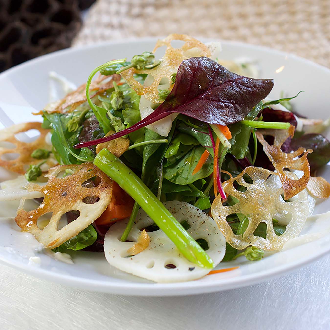 Lotus root, baby spinach, mixed lettuce, asparagus, parmesan, semi-dried persimmon, yoghurt-garlic dressing